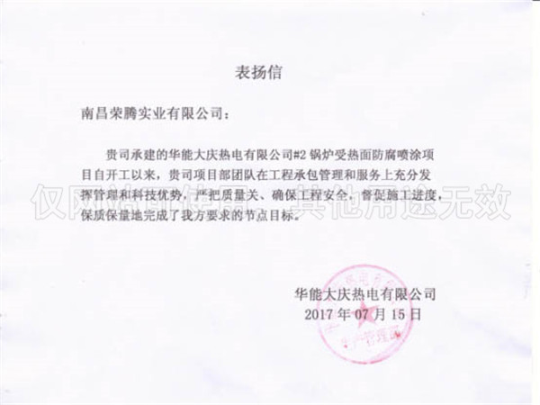 華能大慶熱電有限公司表?yè)P(yáng)信